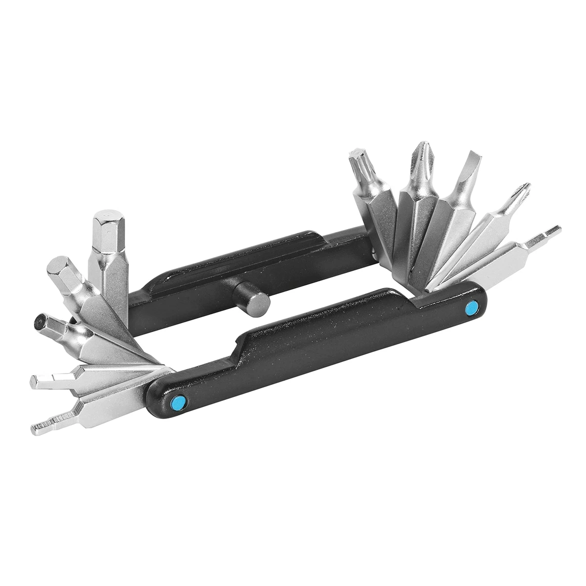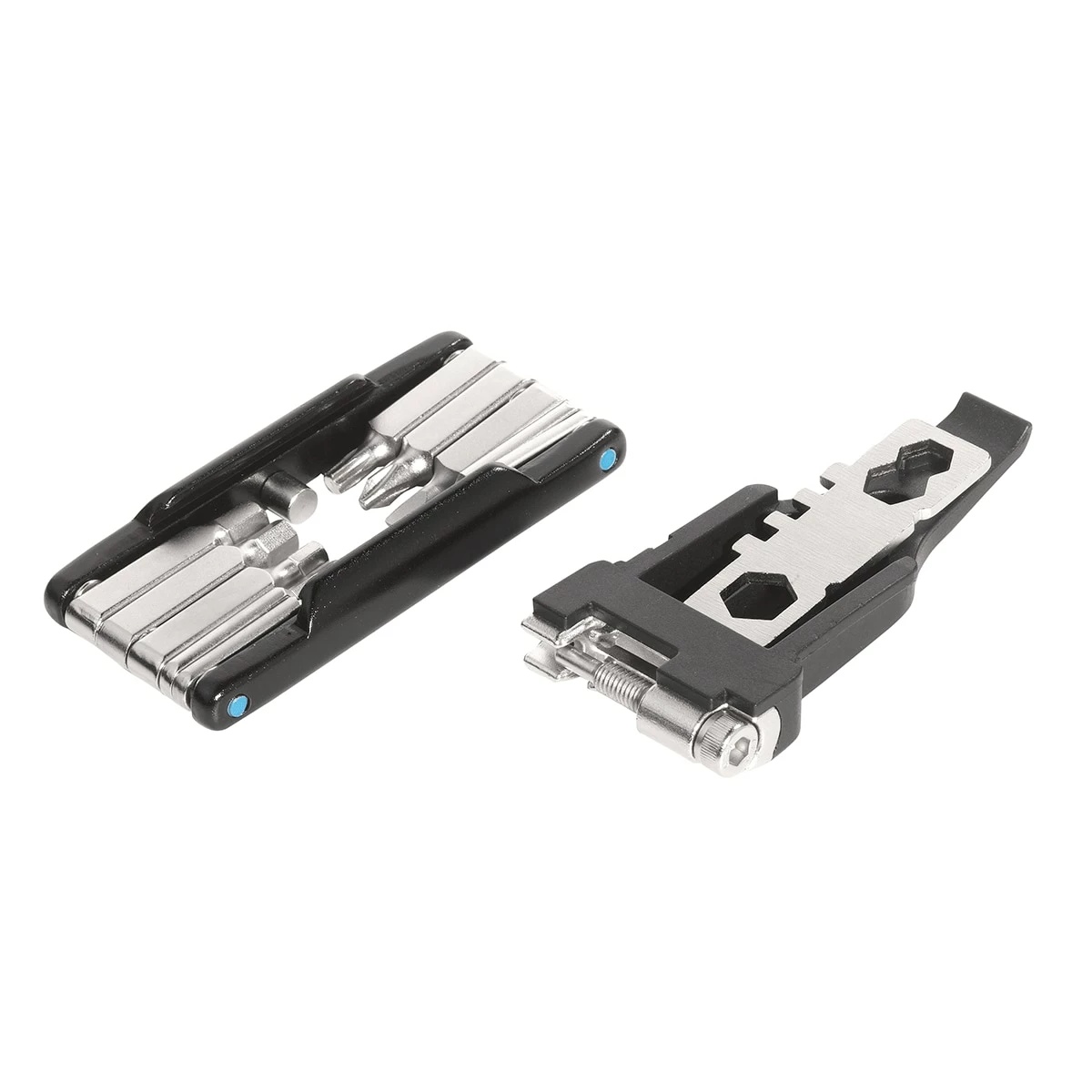Features: Hex wrench (2, 2.5, 3, 4, 5, 6, 8 mm), slotted/cross-head screwdriver, T-25 hexagon socket wrench, chain tool for 7/8/9-speed and Shimano 10/11-speed chains, chain tensioner, 8, 9, 10 mm box-end wrench, nipple tensioner for nipple sizes 3.2, 3.3 and 3.5 mm, tyre lever.