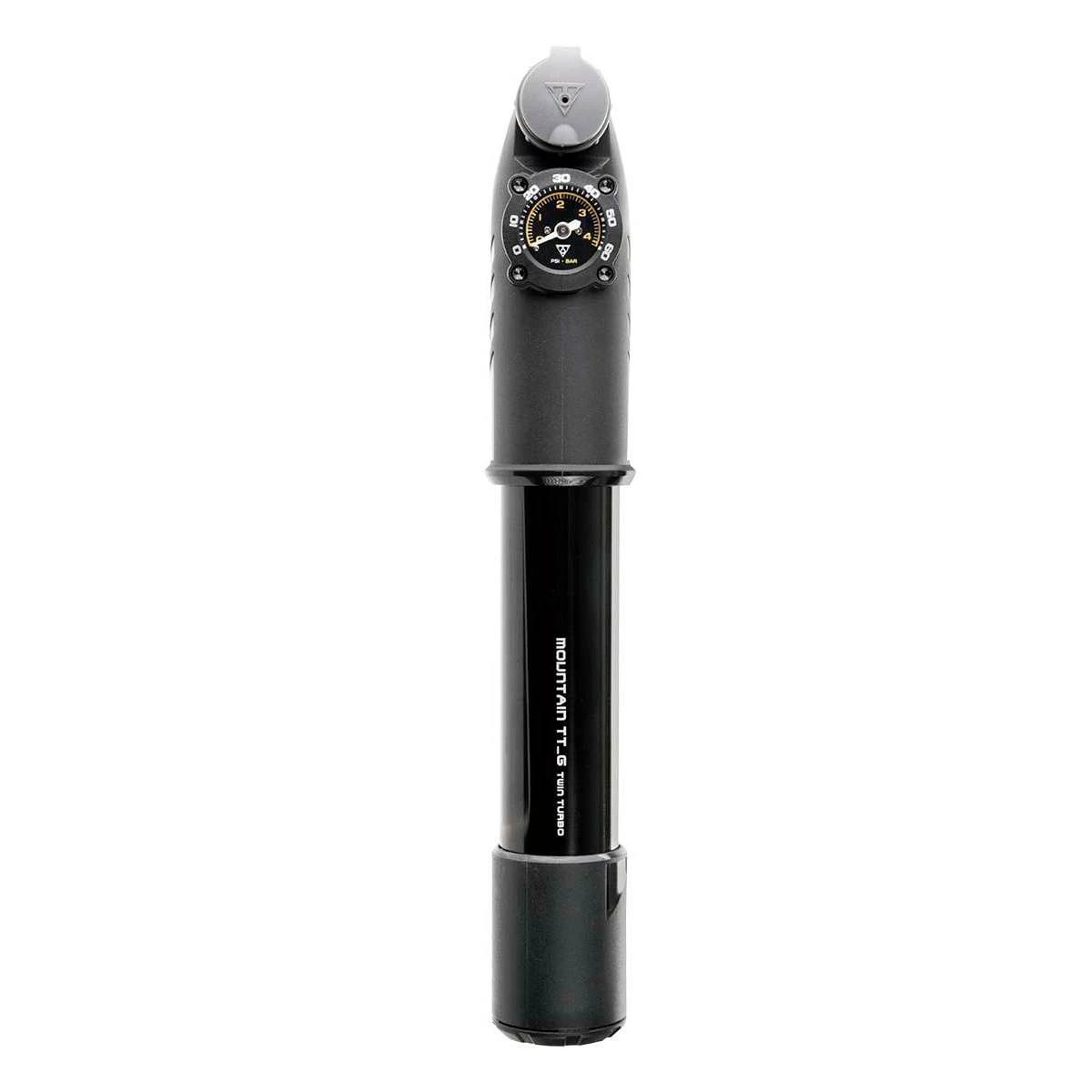 The Topeak Mountain TT_G Mini pump allows for easy trailside inflation of wider MTB tyres, as the TwinTurbo Technology uses both strokes to compress air. Thus, the pump delivers high pressure output which saves time and effort. By pulling the pump piston the larger volume outer barrel compresses huge amounts of air into a smaller diameter inner barrel. This helps you inflate large-volume tyres with ease – whether MTB, MTB Plus or gravel tyres. The easy-to-read gauge reliably shows the pressure needed. A thumb lock lever ensures air-tight seal.