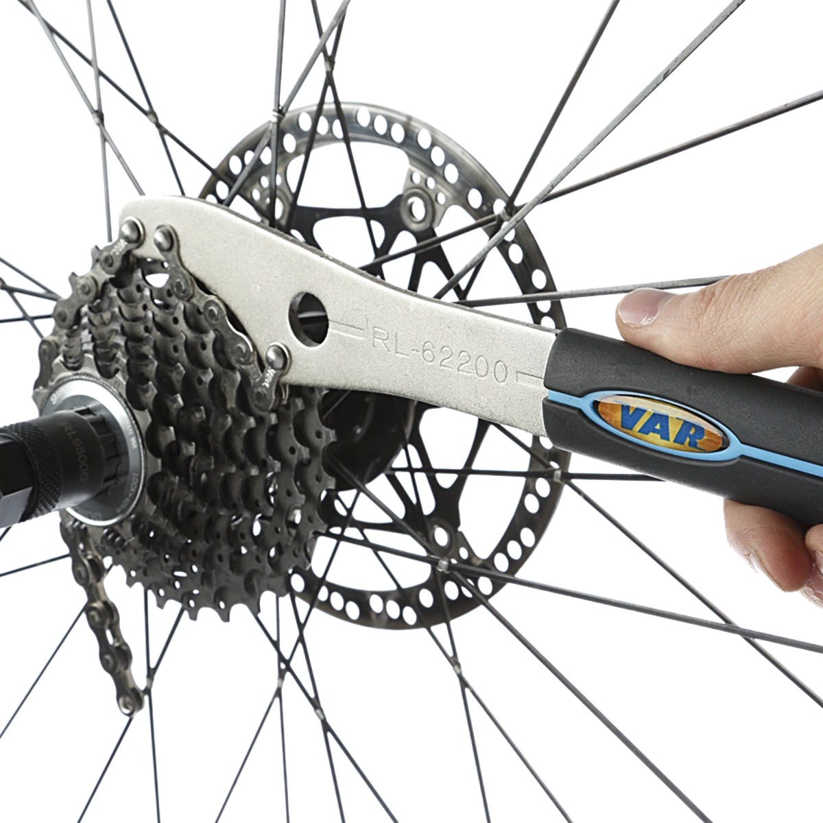 Thanks to a curved tool head with a large contact area, the RL-62200-C chain whip by VAR allows for comfortable handling. The tool head is quite flat so that the robust sprocket remover reliably holds the cassette in position. This allows you to easily remove the lockring using a proper tool and take the cassette off the freehub. The chain whip’s long handle provides great power transfer, while the rubber coating offers high comfort and prevents unpleasant pressure on your palm.
