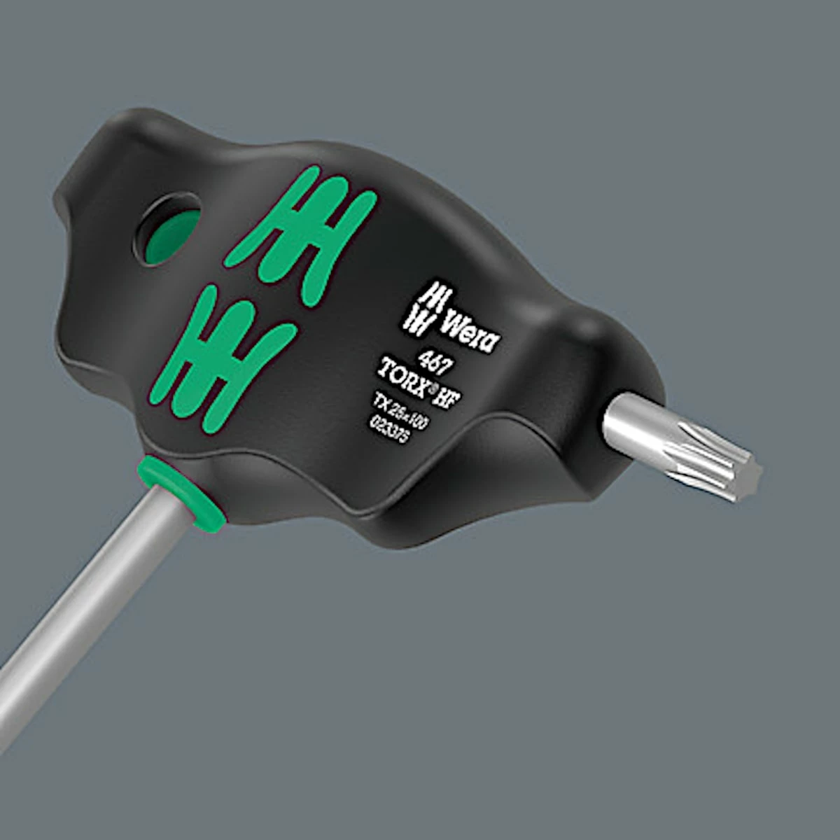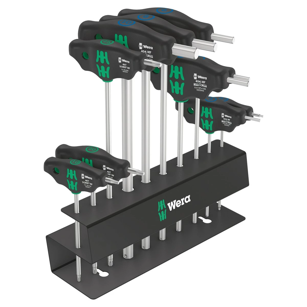 The Wera HF feature works for the TORX® profile thanks to the optimised tool geometry and resulting clamping force. And the clamping of a hex screw to the tool tip is ensured by a spring-loaded ball. This makes it possible to work precisely with the cross-handle screwdriver and also to exert high torques for tightening and loosening the screw connection. The ergonomically-shaped, 2-component cross handle has finger grip recesses and a pleasant surface, so you can count on optimal power transmission and fatigue-free working. You can achieve particularly high torques with the short side tool by using the long arm as a rotary lever. After use, Wera’s T-wrenches can be organised again by size and tool type in the solid metal rack for quick access.