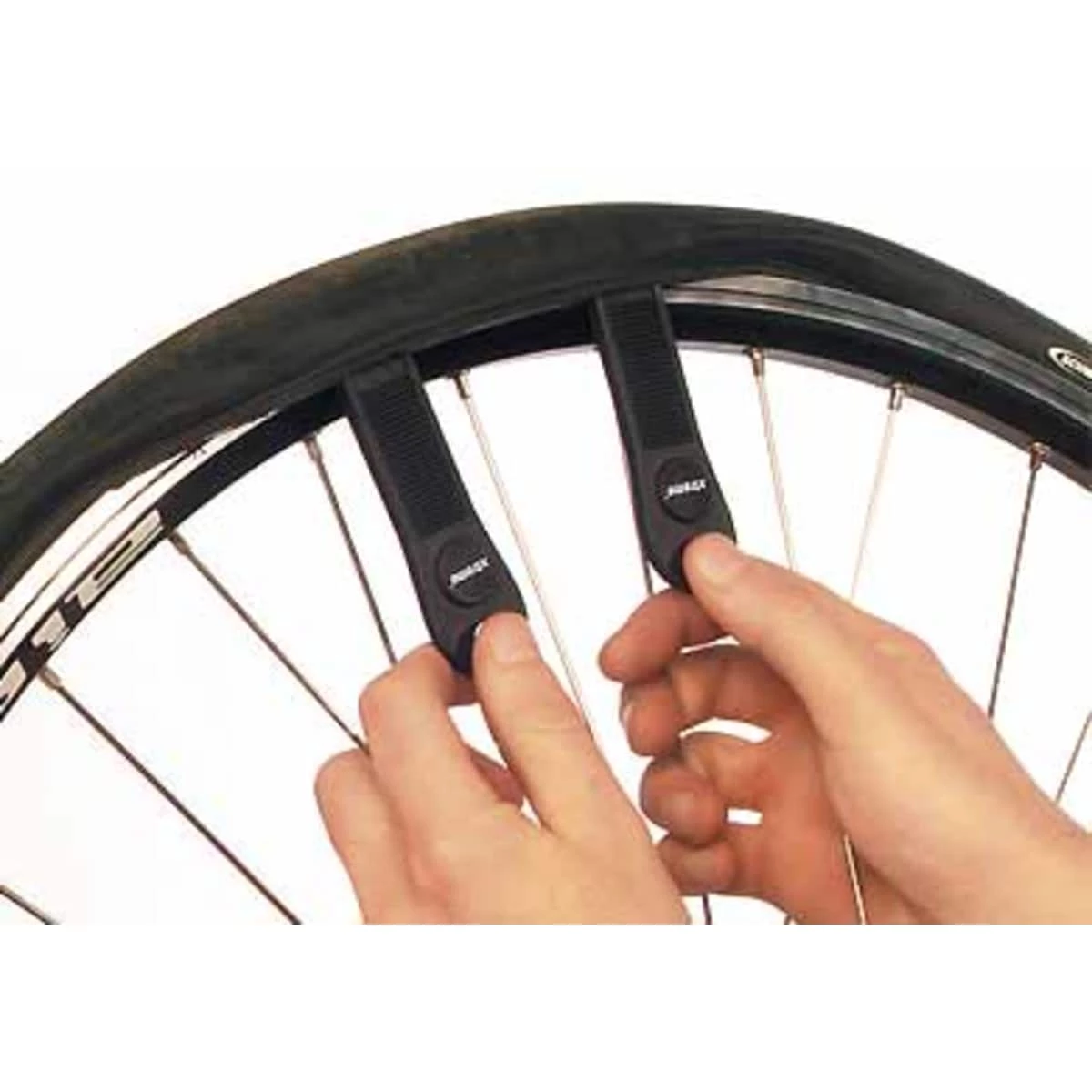 Wide, flat tyre levers that remove even the most stubborn tyre from the rim. The levers made of break-proof plastic can be stuck together easily. Thanks to their width, you only need 2 pieces, which saves space and weight.